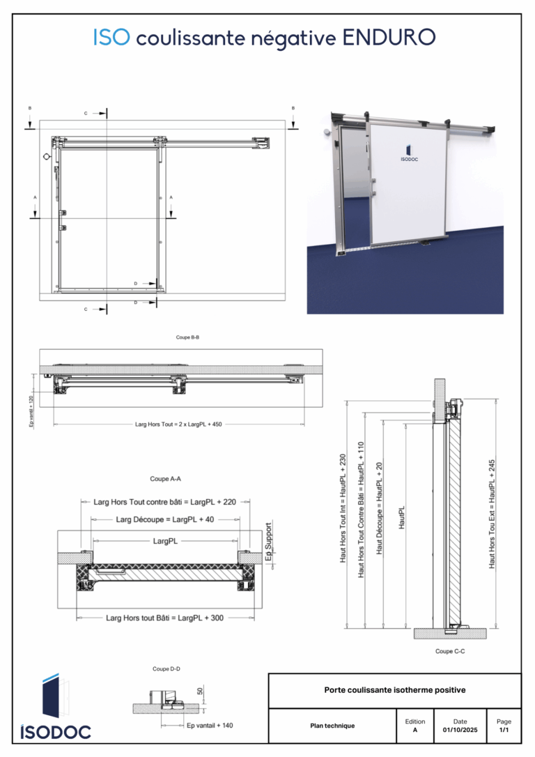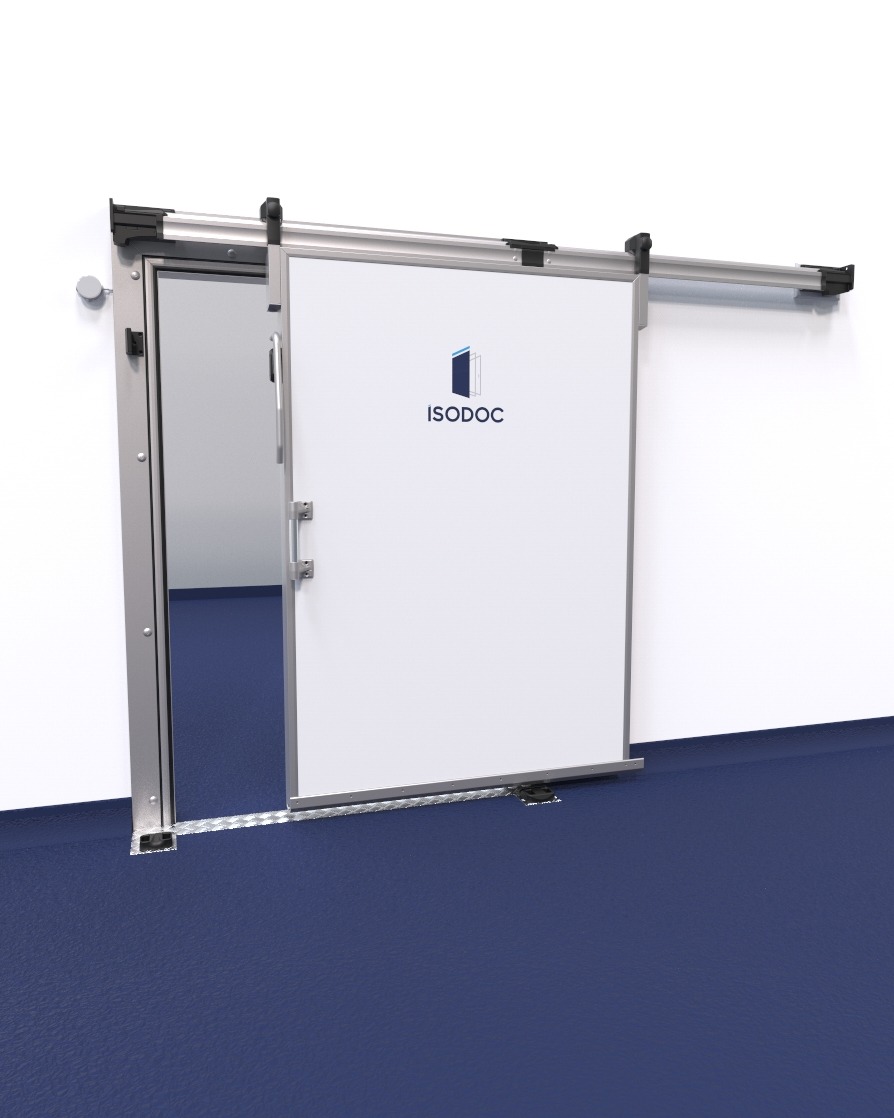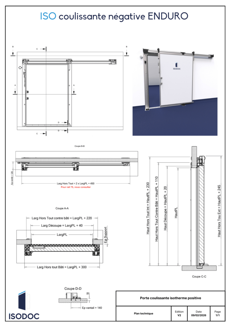Vantail d’une épaisseur de 100 mm, constitué de deux parements polyester injectés en mousse PUR haute densité (45kg/m3) entouré par un profil en inox brossé.