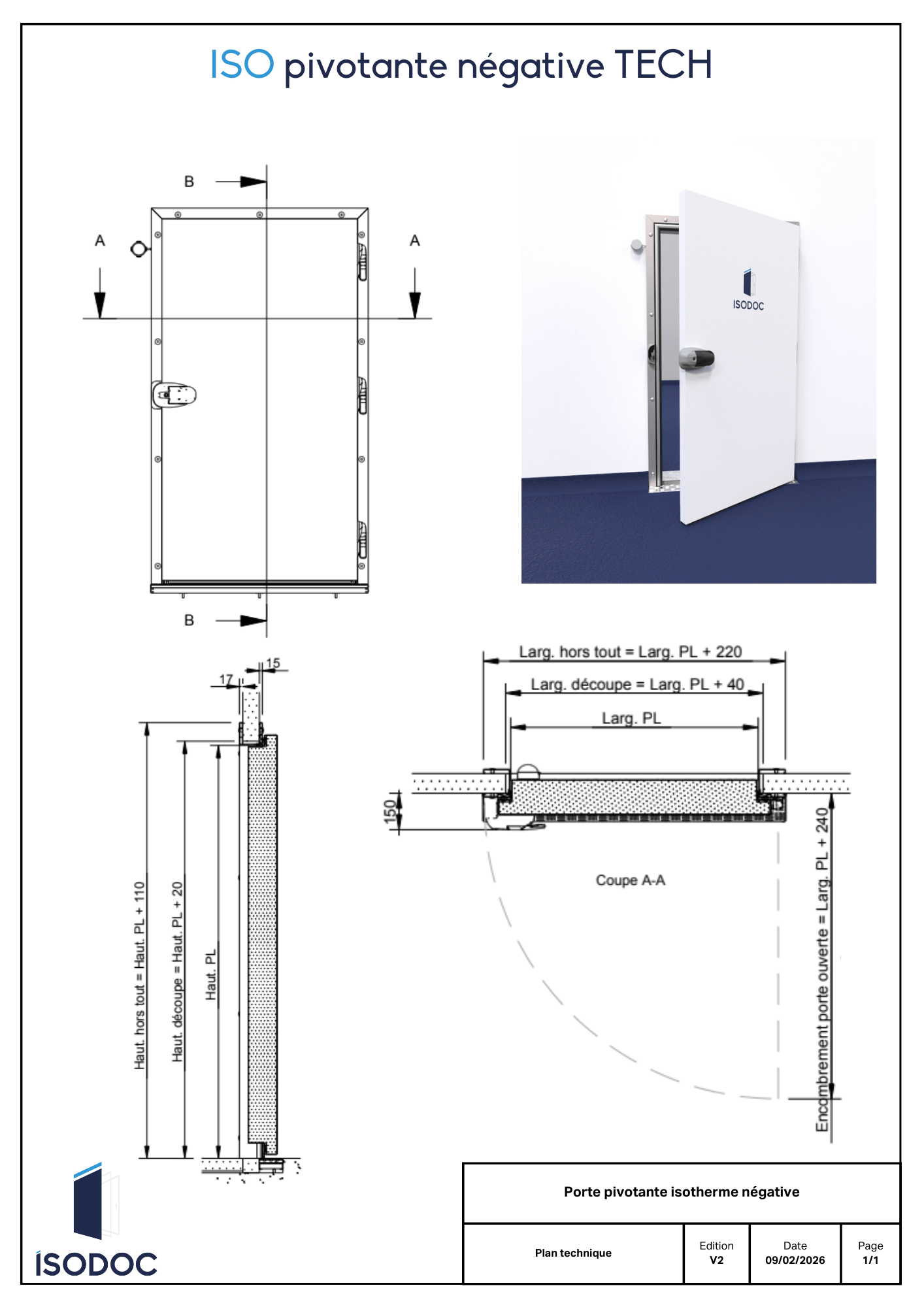 Vantail monolithique semi-encastré d’une épaisseur de 100mm, constitué de deux parements métalliques injectés en mousse PUR haute densité (45kg/m3).