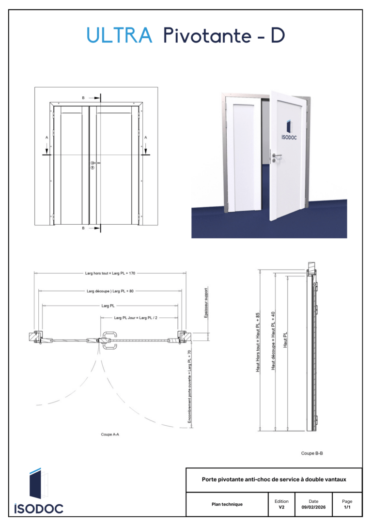 Toutes nos portes sont personnalisables sur demande. Différentes options de hublots, de fermetures, de protections, d’huisseries et de couleurs sont disponibles dans notre catalogue.