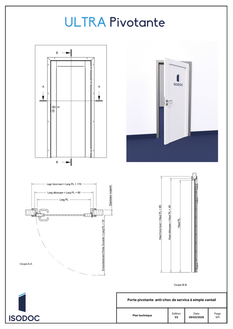 Toutes nos portes sont personnalisables sur demande. Différentes options de hublots, de fermetures, de protections, d’huisseries et de couleurs sont disponibles dans notre catalogue.